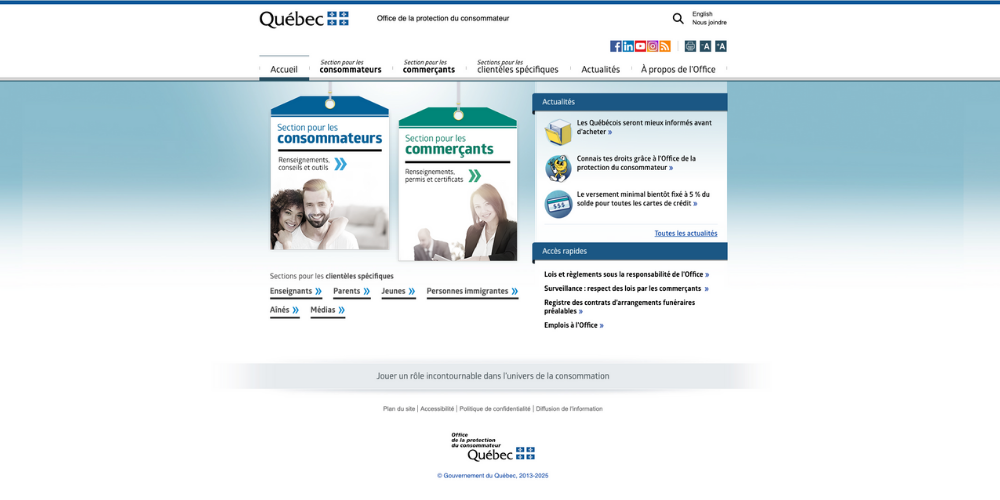 L’Office de la protection du consommateur est un organisme du gouvernement du Québec qui veille à ce que les commerçants respectent leurs obligations envers les consommateurs. Il aide également les citoyens à faire des choix éclairés, connaître leurs droits et savoir quels recours entreprendre en cas de problème avec un commerçant.